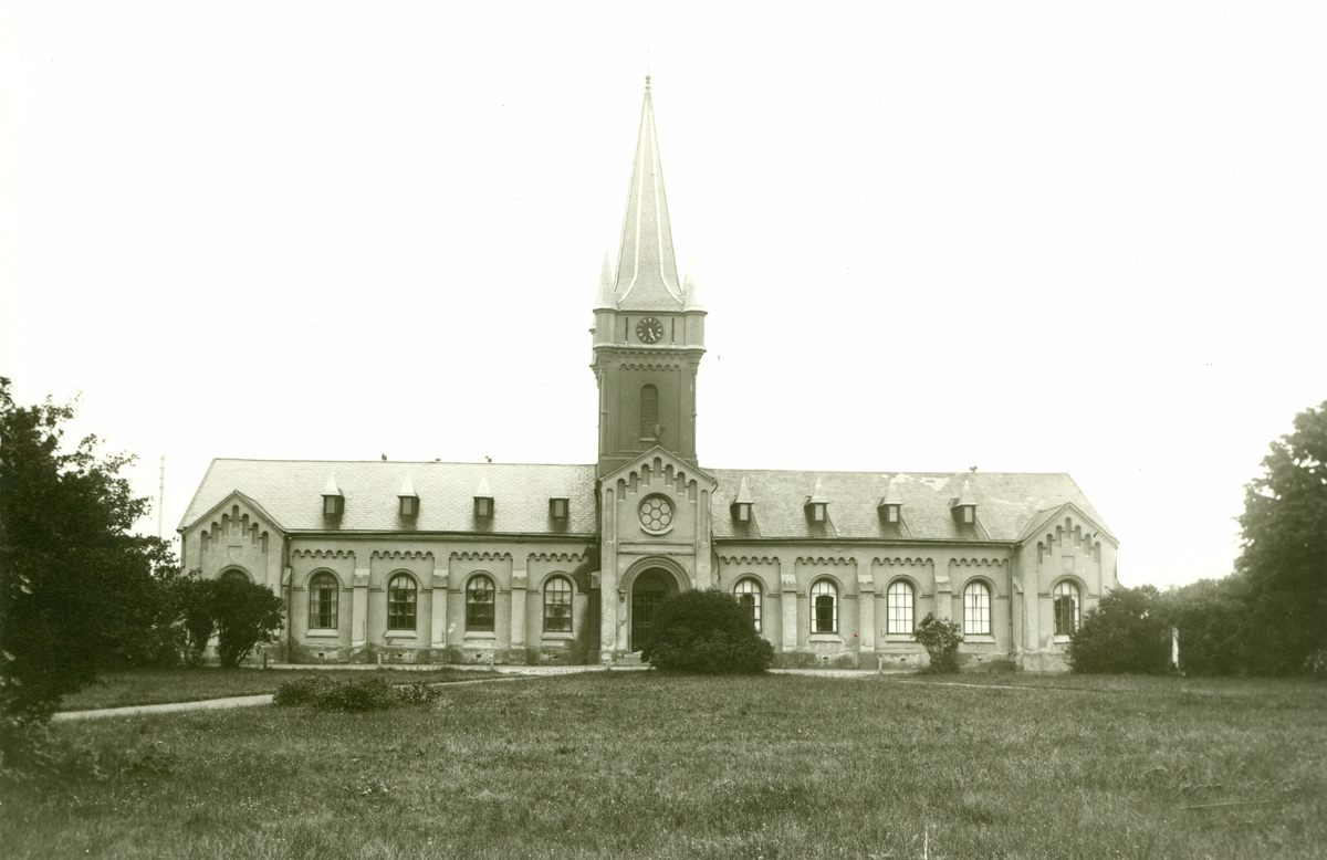 Borgholms kyrka på ett foto från 1906. En buske skymmer en del av kyrkporten.