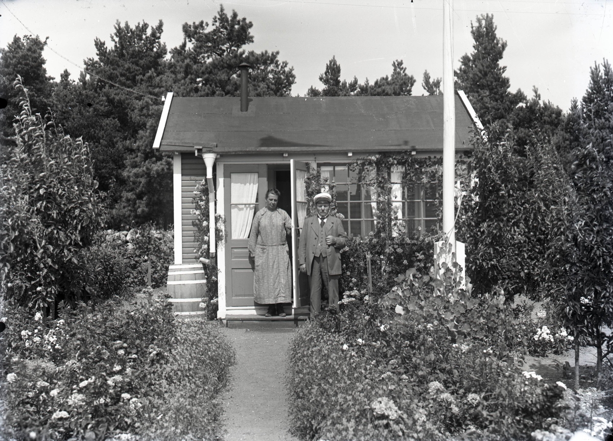 En man och en kvinna vid en liten stuga i Kalmar södra koloniområde, fotograferat omkring 1930. Kalmar södra koloniförening grundades 1917 och har idag 105 kolonilotter. Området ligger strax söder om länssjukhuset i Kalmar med huvudingång från Stensbergsvägen.