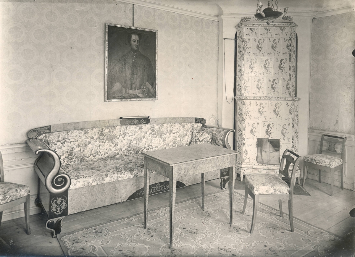 Rum till vänster om förstugan. Soffa av björk med förgylld, inlagd dekoration.