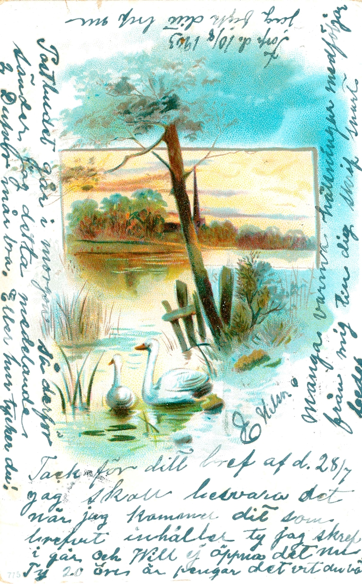Vykort skickat till Kristina Andersson, född 1865 i Böda, syster till N J Andersson, när hon bodde i USA. Det är skrivet av Edvard Nilsson i Böda. Edvard har skrivit till Kristina runt motivet på framsidan: "Torp den 10/8 1903. Jag fick ditt bref nu. Tack för ditt bref af d 28/7 jag skall besvara det när jag kommer dit som brefvet innehåller ty jag skref i går och will ej öppna det nu. Ty 20 ören är pengar det vet du väl. Postbudet går i morgon så därför sänder jag detta meddelande 2 dufvor mår bra. Eller hur tycker du! Många varma hälsningar medföljer från mig till dig. Skrif snart bedes. E Nilson"