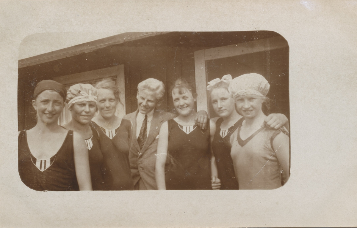 Handskriven text på fotots baksida: Simmagistrarna 1918 från vänster Agda Werner, Ruth Svensson, Hilma Jonsson, Gunnar Skoglund, Inga Nyman, Sissan Rydell, Lalla Sjöqvist.