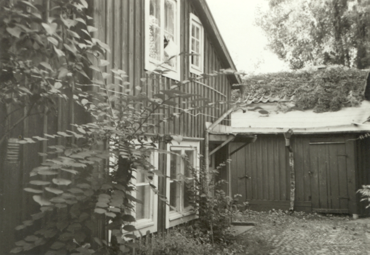 En stenlagd innergård med trähusbebyggelse.