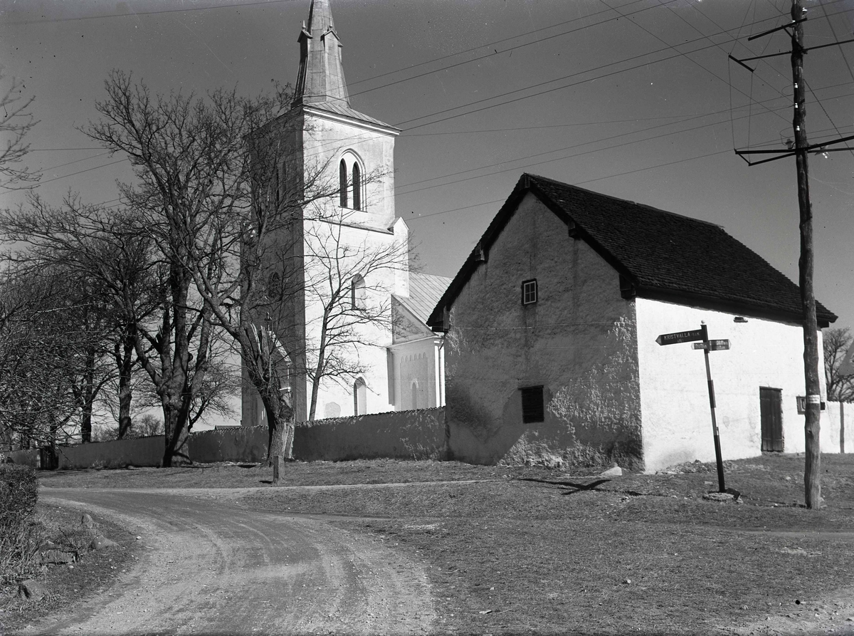 Förlösa kyrka i Gustaviansk stilepok. Bårhus i förgrunden.