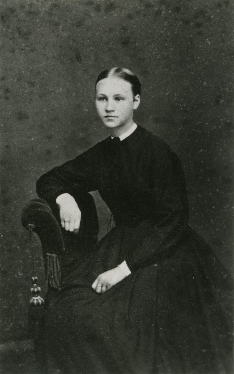 Emelie Kjöhlberg, dotter till J. P. Kjöhlberg i andra giftet. Född 22/11 1851. Gift med folkskolläraren Gustaf Adolf Roosval. Död 14/1 1938. Fotot taget vid 19 års ålder.