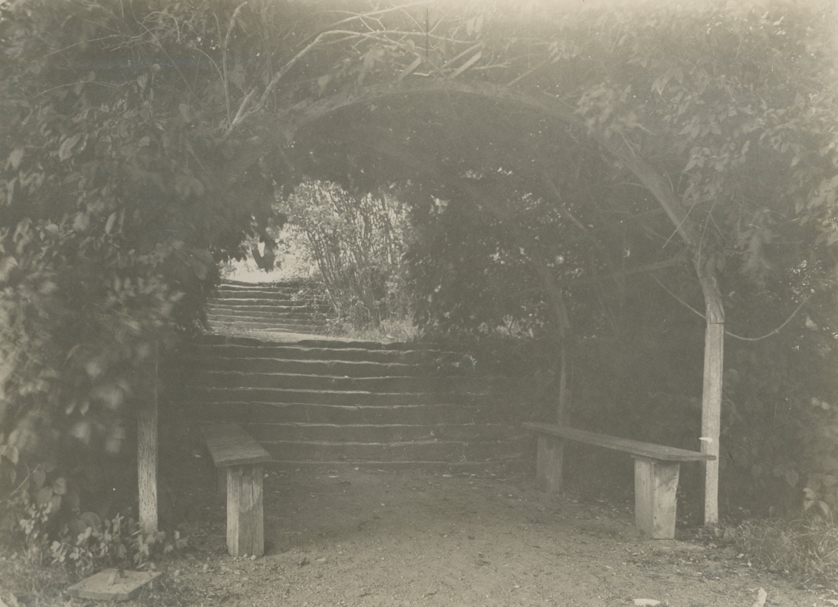 Trädgården: Trappor mellan terasserna med pergolor av syrén m.m. Bänkar i pergolorna.
