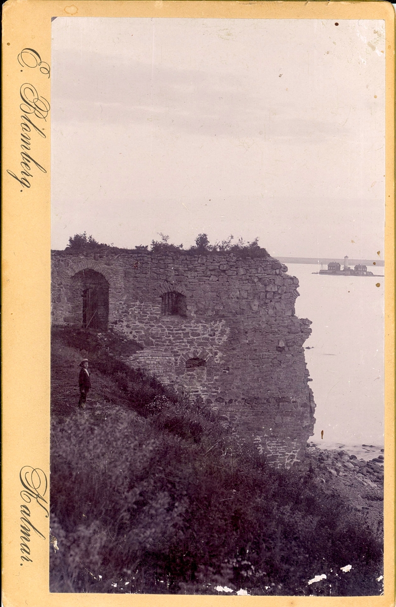 Kalmar slott. Sydvästra postejen i förgrunden, och Grimskär i bakgrunden.