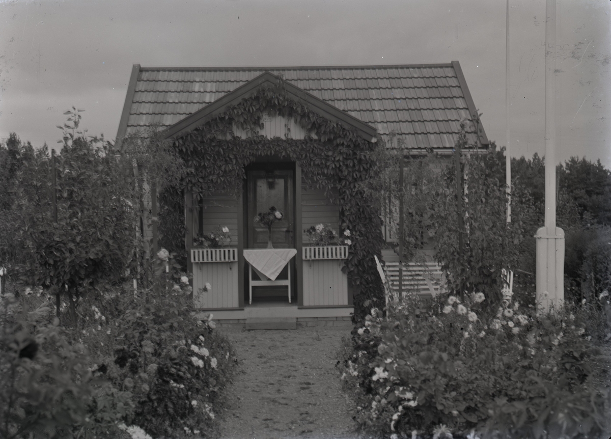 En stuga vid Kalmar södra koloniområde, fotograferad omkring 1930. Kalmar södra koloniförening grundades 1917 och har idag 105 kolonilotter. Området ligger strax söder om länssjukhuset i Kalmar med huvudingång från Stensbergsvägen.