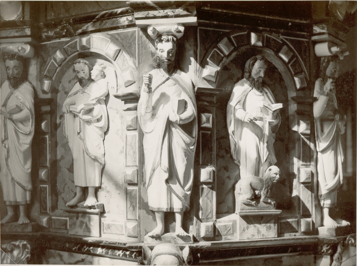 Detalj av den snidade predikstolen med apostlarna i Lofta kyrka.