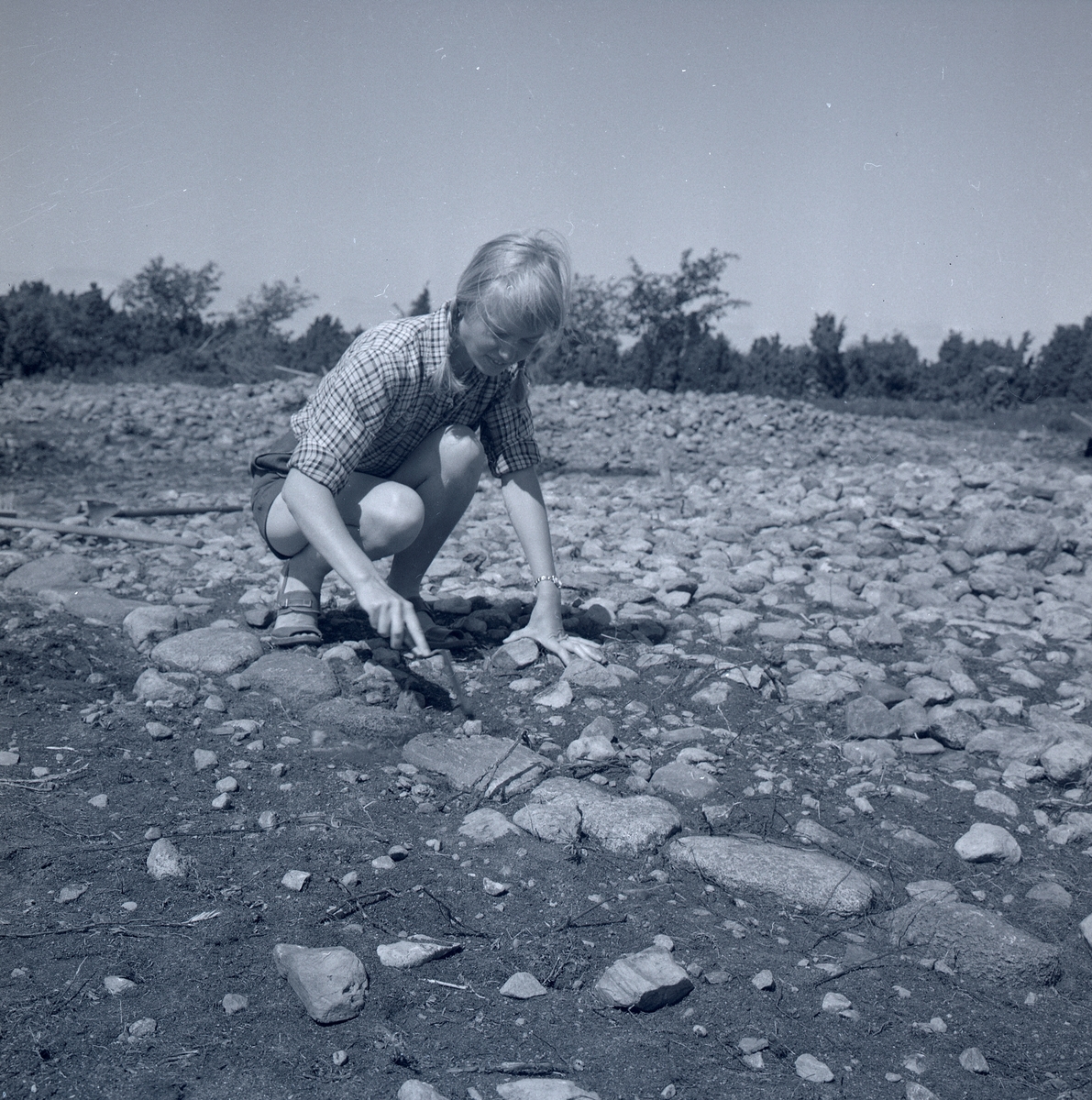 Filosofie studerande Ebba-Stina Carlsson vid Nybyåsen. Vid Nybyåsen och Långerumsåsen har man ofta begravt de döda. Under utbyggnaden av väg 136 undersöktes drygt halva gravfältet på Långerums samfällighet. Inventeringen omfattade ett 20-tal gravar och 30 anläggningar, varav två boplatslämningar. Efter avtorvningen visade sig åsen vara täkt av en tät matta av sten som gav utryck av ett "stentorg".