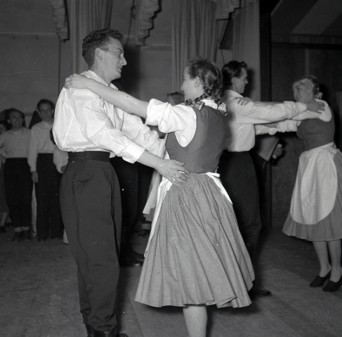 Bild tagen i samband med flyktingar ifrån Ungern 1956. Folk som dansar i förmodlingen Godtemplargården i Borgholm. Kvinnorna dansar i traditionella romska folkträkter. Hösten 56 - våren 57.
