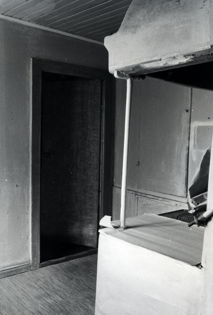 Övervåningens kök med dörr mot baktrappan i en fastighet på Fiskaregatan.