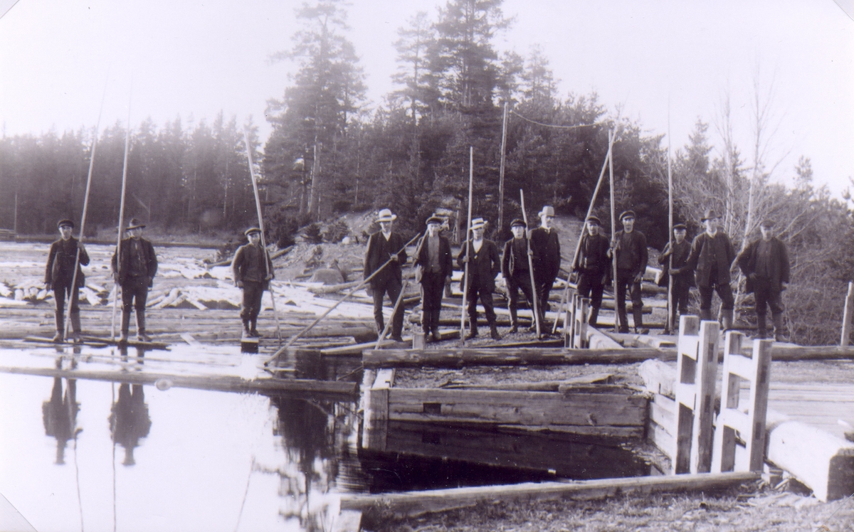 Flottare uppställda för fotografering vid dammen i Barkeström.