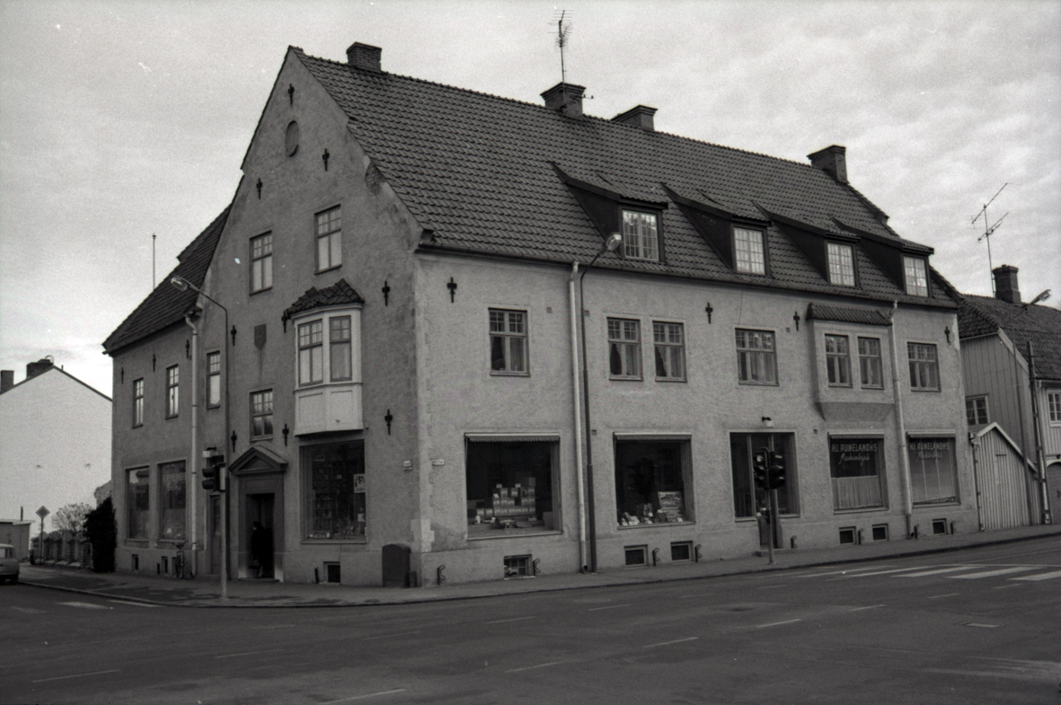 Runelandhs Maskinbyrå, i en byggnad med ankarslut, burspråk och takkupor.