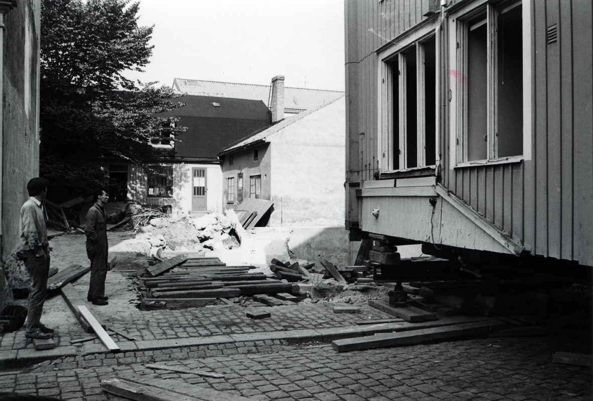 Areskogska husets flyttning 30.9. - 3.10. 1970. Den ursprungliga tomten i kvarteret Apotekaren och husets baksida.