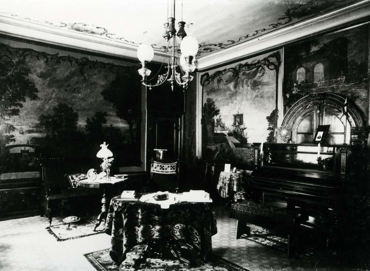 Interiören av Hantverkshuset år 1908. Det finns bord, piano, soffa och väggmålningar.
