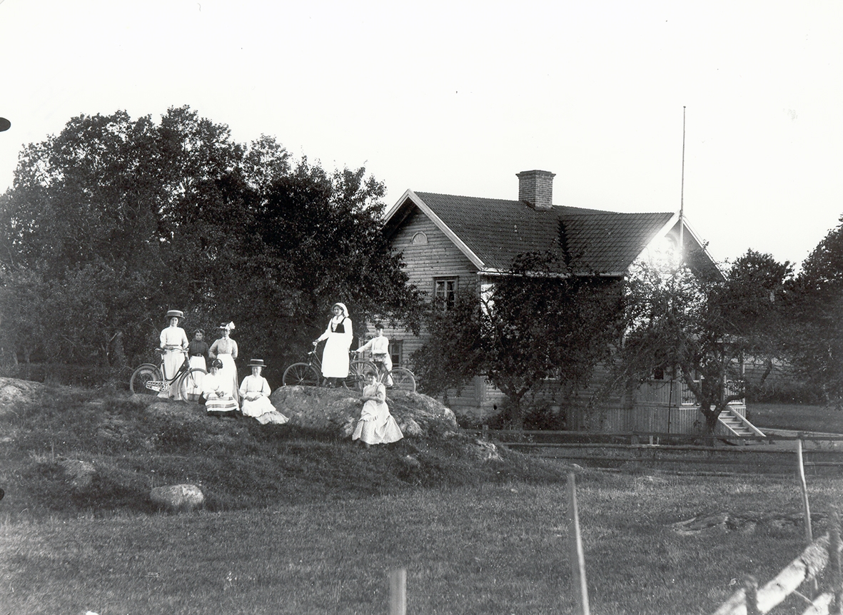 En grupp kvinnor i tidstypiska kläder, utanför Rosanders bostad i Getterum, Hjorted.
