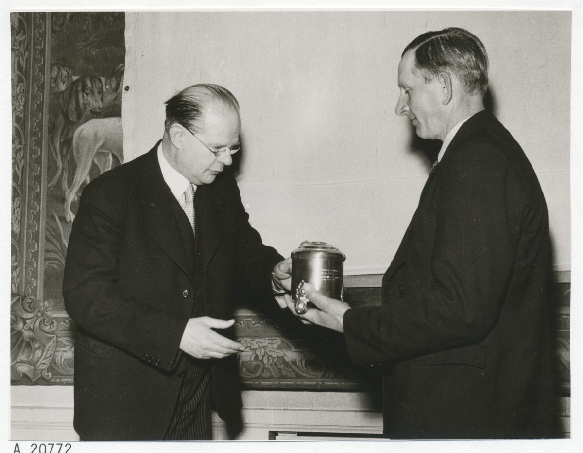 Landshövding Ruben Wagnsson som ger ett tennkrus som gåva vid uppvaktning.