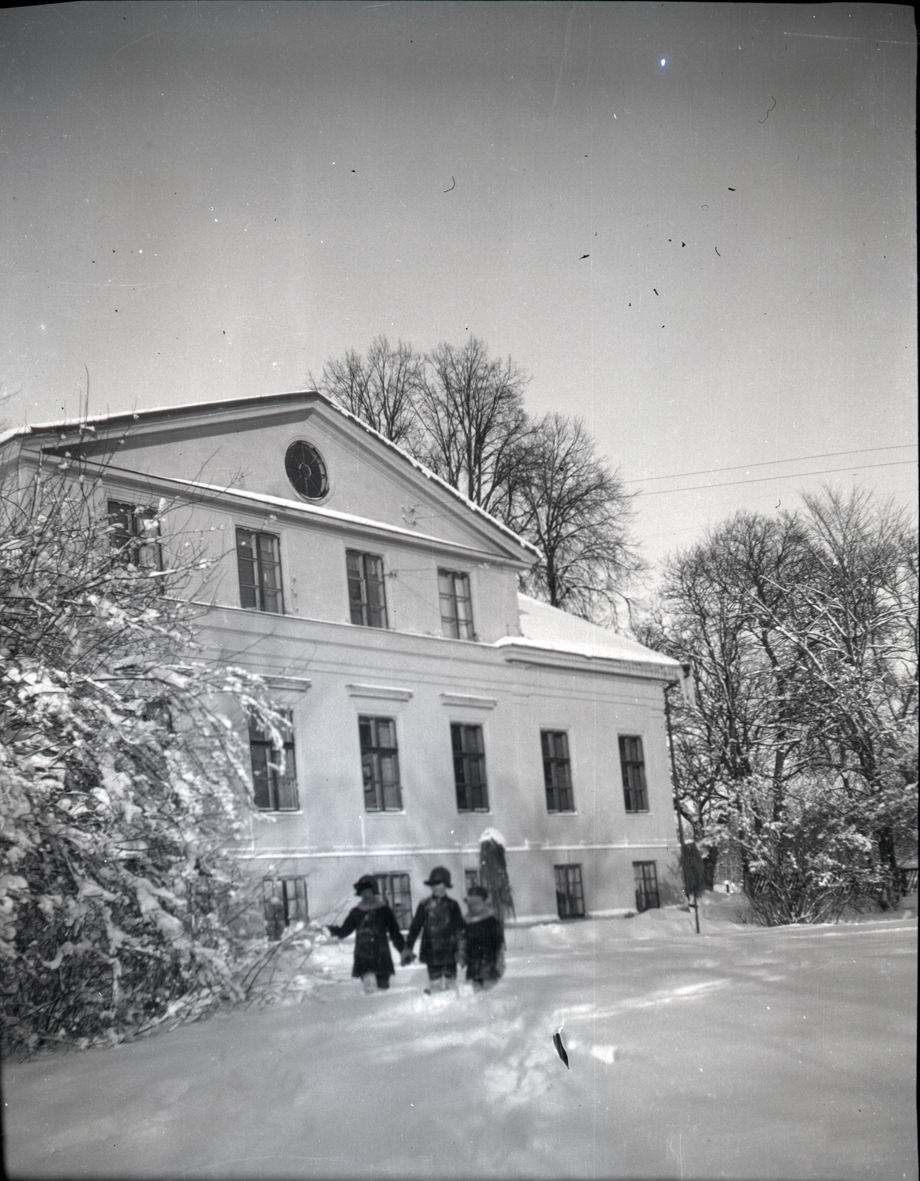 Tre personer framför huvudbyggnaden på Tuna gård under vintertid.