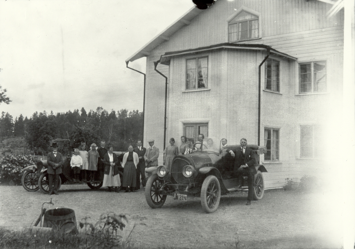 Lebo gård med byggnader och bilar 1922. Till vänster en 1910 tals T-Ford och M314 en N.A.G 1913 registrerad på Ragnar Rasmusson Lund.