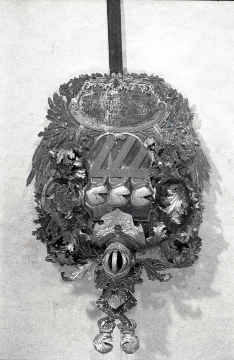 Epitafium. Begravningsvapen, huvudbaner. Vapen bestående av tre hjälmar i guld i övre fältet, därunder tre snedställda band. Inskription: