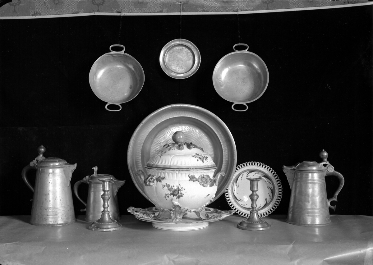 Soppterrin, tennstop, ljusstake och tenntallrik från antikhandlare Runberg.
