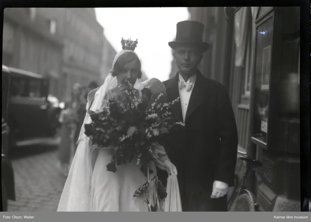 Beställare fotograf Staffan Kronberg, Mäster Samuelsgatan 34, Stockholm. Brudparet är Staffan Kronberg, son till konstnären Julius Kronberg, och Kerstin Margareta Olson, dotter till stadsarkitekt J Fred Olson i Kalmar.