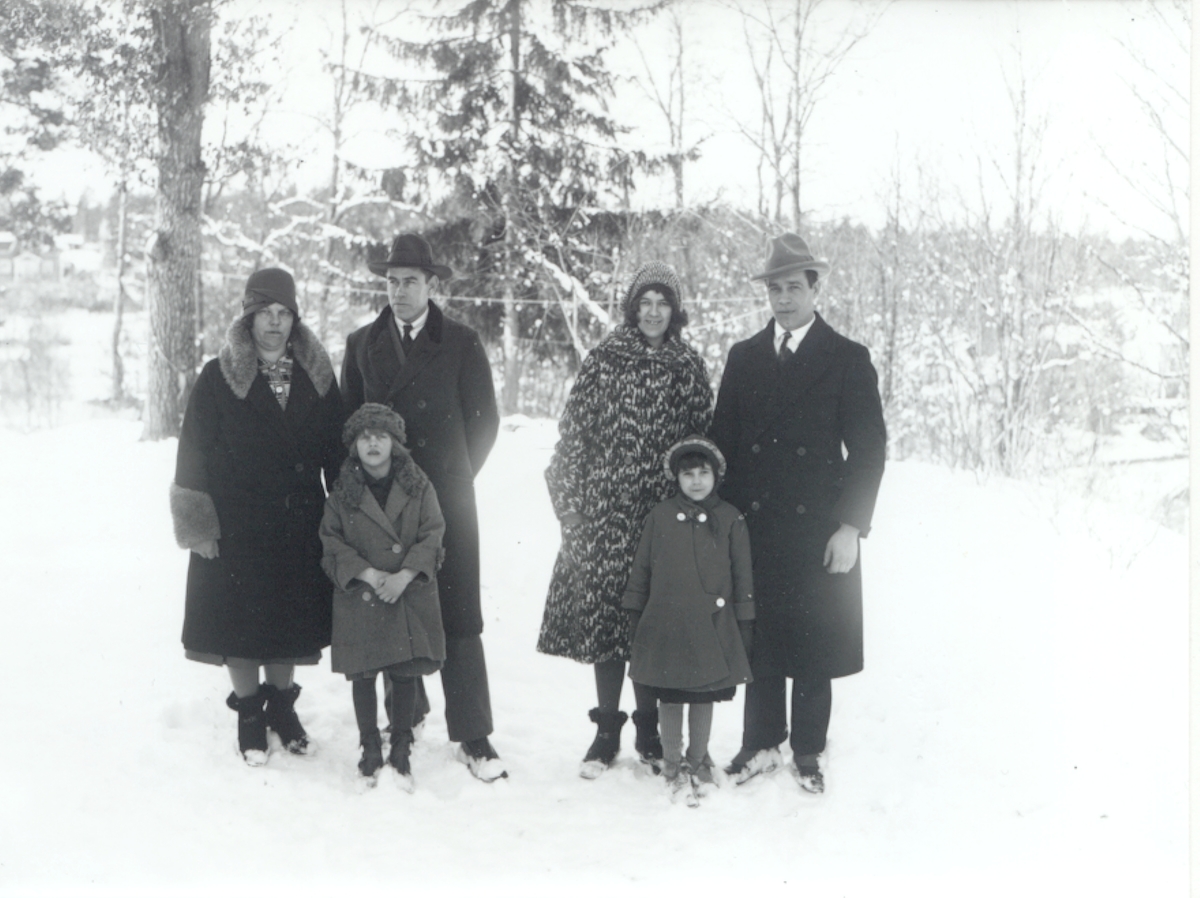 Vinterpromenad. Till vänster: Verner Jönsson med maka Ester och dotter Gerd. Till höger: Oskar Frodig med maka Gerda och dotter Effer.