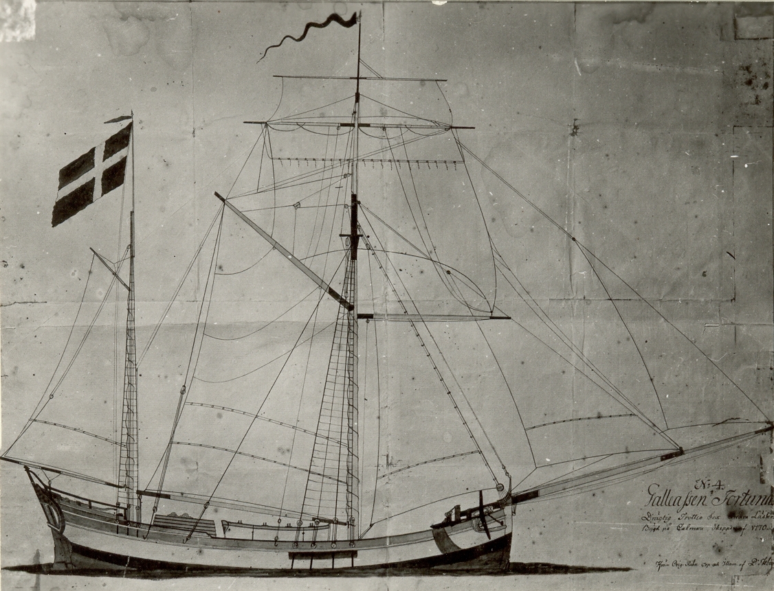 Varvsritning, teckn. kolor. Text: Nr 4. Galeasen Fortuna. Dräktig trettiosex swåra läster.Byggd på Calmar Skepps Warf 1770.