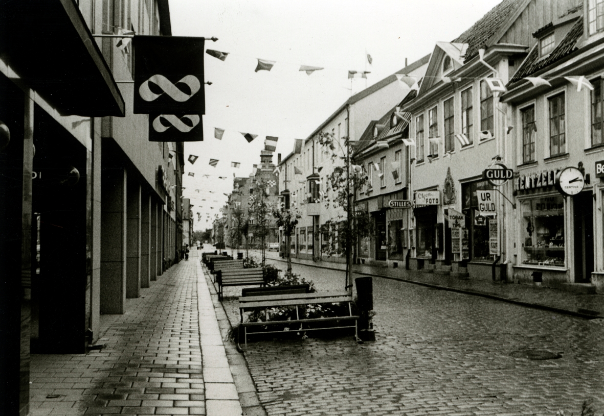 Kvarteret Apotekaren mot Storgatan. Butiker och linor med små flaggor mellan husen.