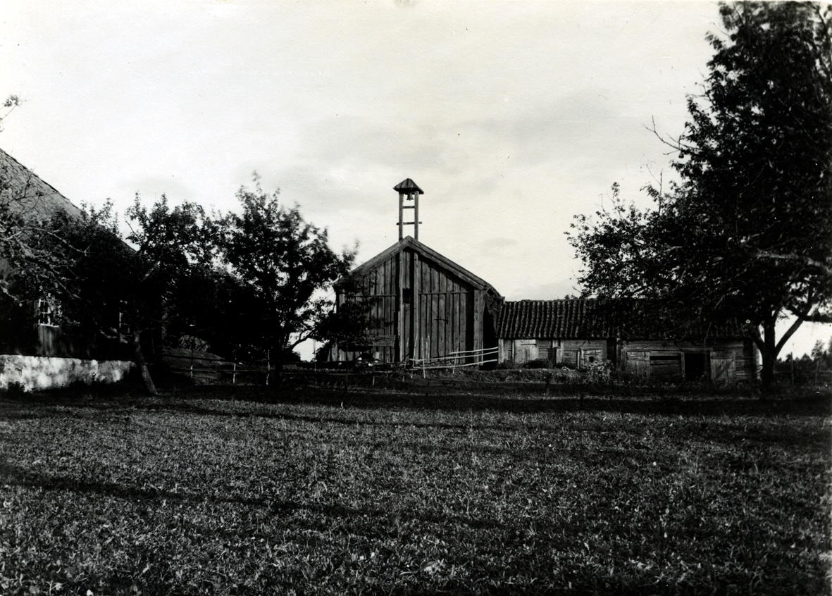 Till vänster huvudbyggnaden, i mitten matbod, till höger svin- och hönshus med mera.