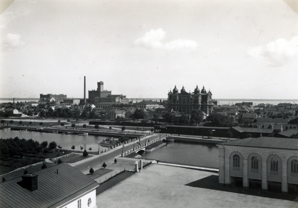 Vy över Fredriksskansbron. Bilden är tagen från Kalmar Högre Allmänna Läroverk, senare Stagneliusskolan, vars gymnastiksal ses till höger. I bakgrunden Ångkvarnen till vänster och domkyrkan till höger.