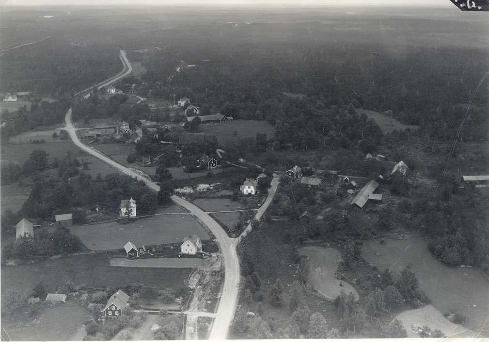 Flygbild över Kråksmåla från söder. I bildens mitt anas Kråksmåla kyrka och klockstapel.