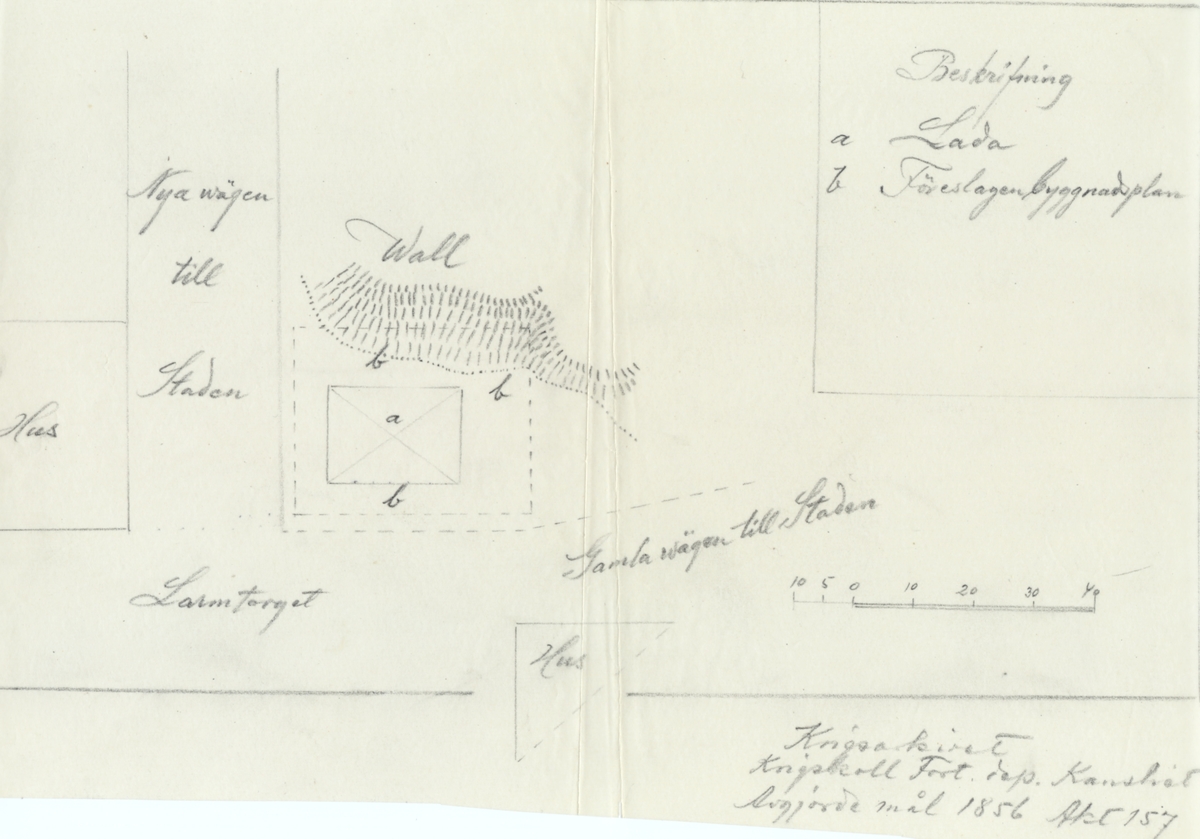 Karta över tomt Nr 44 uppmätt 1856. Avgjorda mål 1856 Akt 157. På denna tomt byggdes sedan Teatern, invigd 1862.