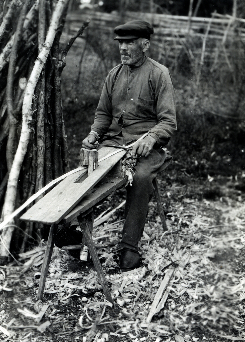 Korgmakaren Johan Ek på torpet Skogstorp utanför Orrefors tillverkar vidjor som ska användas till korgflätning.