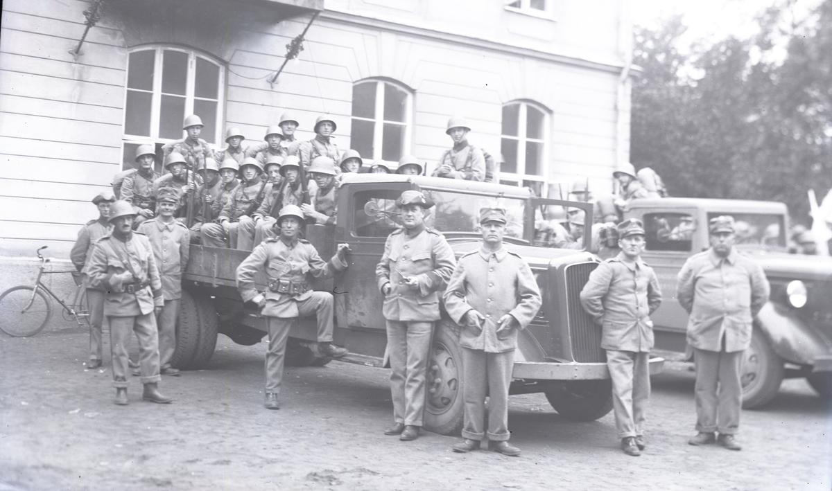 Landstormen har övning vid tiden för andra världskrigets utbrott. Bilden troligen tagen vid gamla lasarettet.