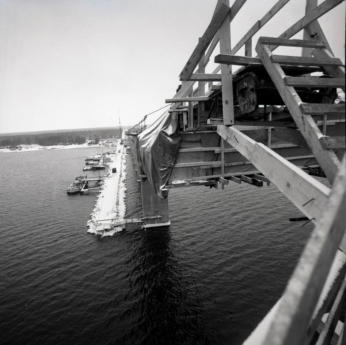Från byggandet av Ölandsbron. Fotot är taget från sundet. Längs bron löper den vägbank som användes för att transportera material.