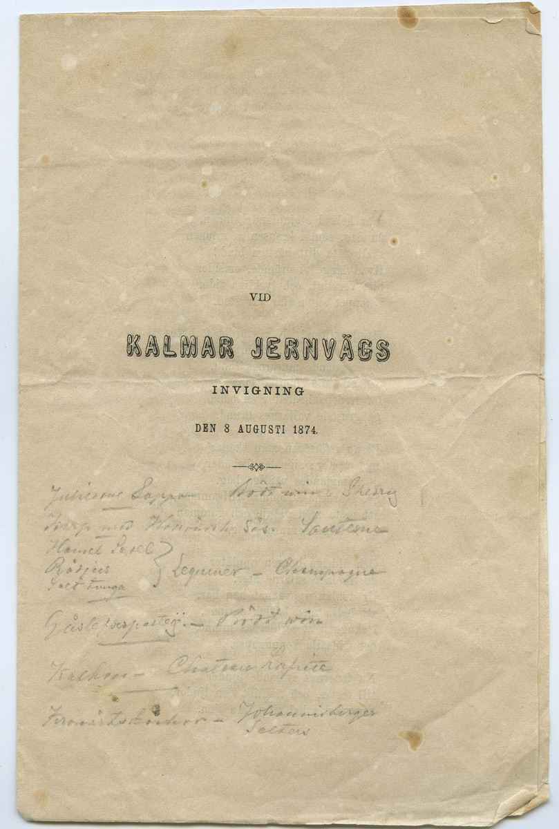 Vid Kalmar Jernvägs invigning den 8 augusti 1874. Text med blyerts på framsidan: Julienne soppa, rött vin, Sherry. Karp med Hollandaisesås, Sauterne. Rådjur - Salt tunga, legymer - champinjoner. Gåsleverpastej, rött vin. Kalkon, Chateau Lafitte. Johannisdegar, Selters.