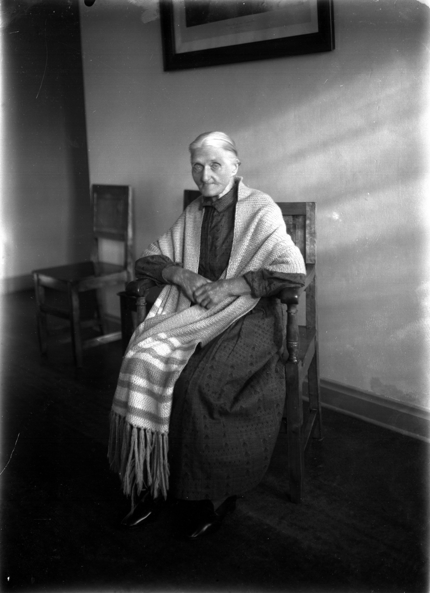 En kvinna som sitter ner på en karmstol. Hon har en sjal på sig. Enligt Walter Olsons journal är bilden beställd av Oskar Karlsson ifrån Manillagatan 19.