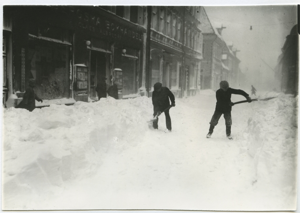 Snöskottning vid hörnet Södra Långgatan - Kaggensgatan efter en snöstorm den 1:a mars 1931.