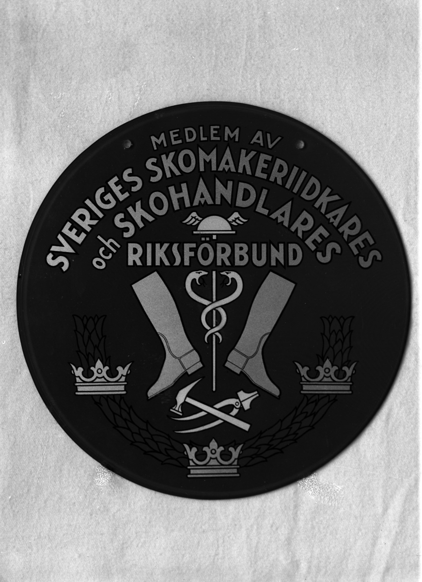 Affärsskylt med inskriptionen "Medlem av Sveriges Skomakeriidkares och Skohandlares Riksförbund".