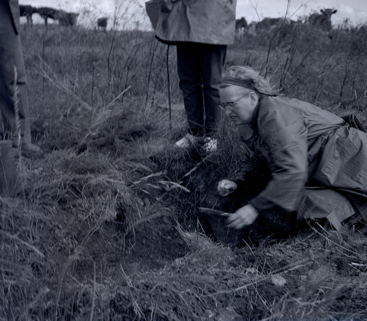 Dr. Ragnhild Boström i Kårehamn gör en arkeologisk undersökning, juli 1962.