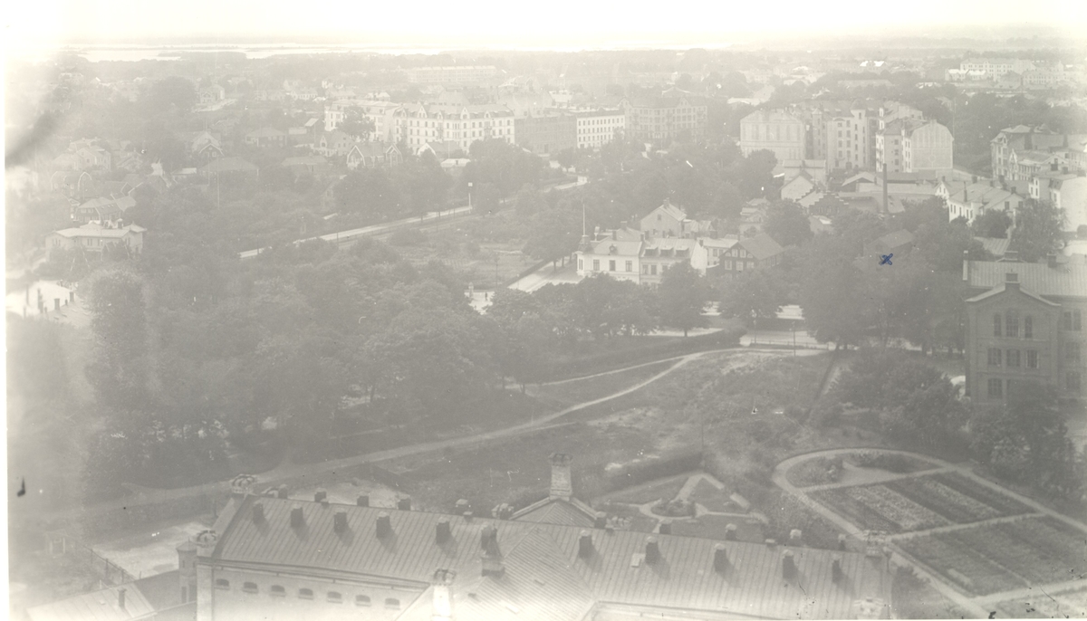 Fängelset i förgrunden, Tullskolan, Framstahusen och Bremerlyckan i bakgrunden. Trädgårdsanläggningen mellan fängelset och Tullskolan är skolans köksträdgård där eleverna fick lära sig trädgårdsodling. Kortet är taget någon gång i början av 1900-talet.