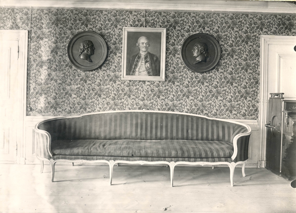 Huvudbyggningen på Strömsrum, nedre våningen. Matsalen. Tapet från 1800-talets mitt. Oljeporträtt föreställande landshövding Rappe.