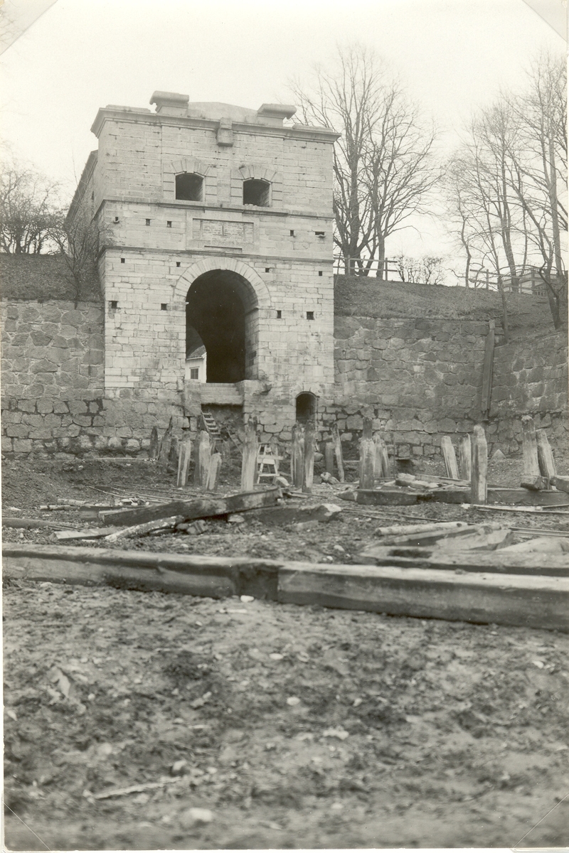 Delar av den gamla bron över Systraströmmen då denna var torrlagd.