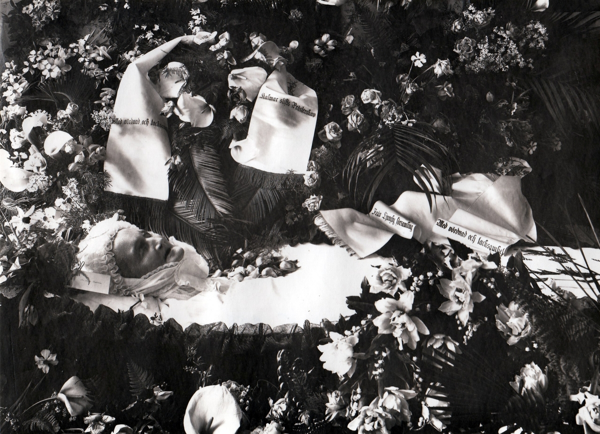 Biskopinnan Maria Sophia Sjöbring, född Rogberg, står lik 1909. Förr var det mycket vanligt att man fotograferade lik och behöll bilden som minne.