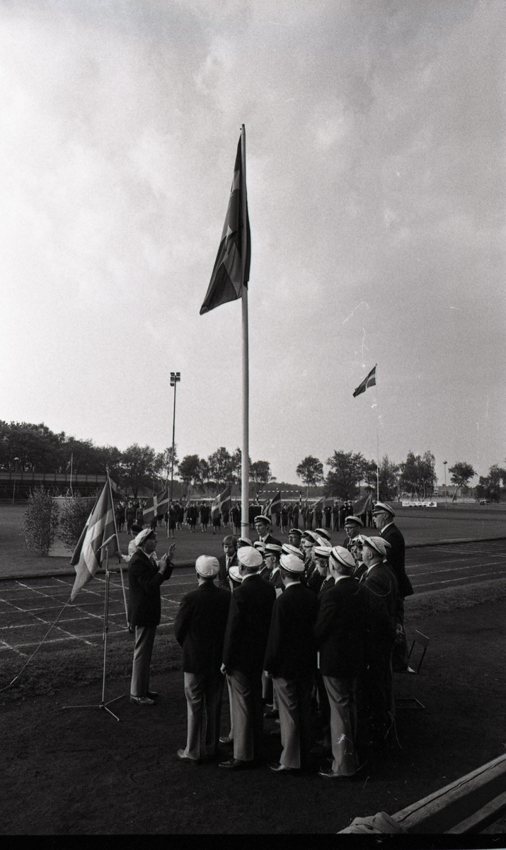 Kalmar manskör sjunger runt den hissade svenska flaggan på Fredriksskans på svenska flaggans dag 1972.