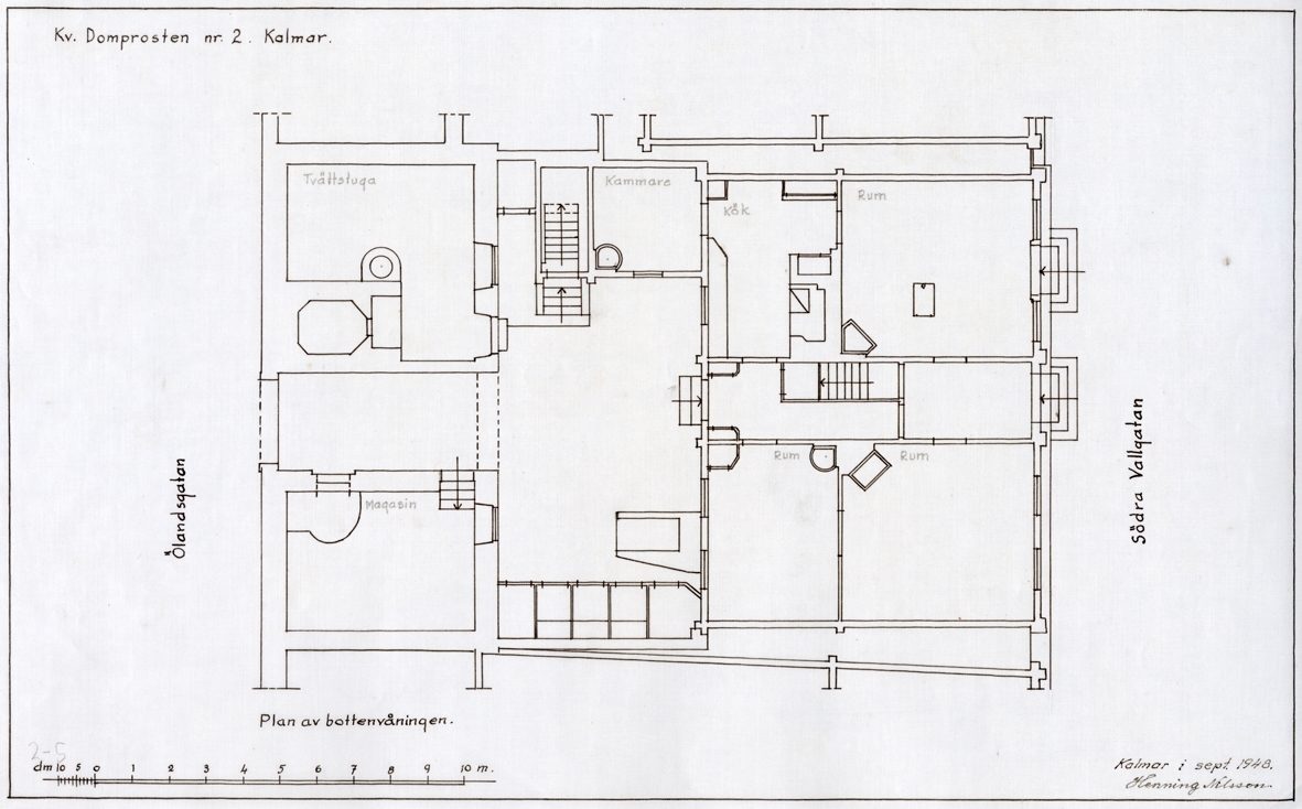 Planritning över bottenvåning i kvarteret Domprosten, mellan gatorna Ölandsgatan och Södra Vallgatan.