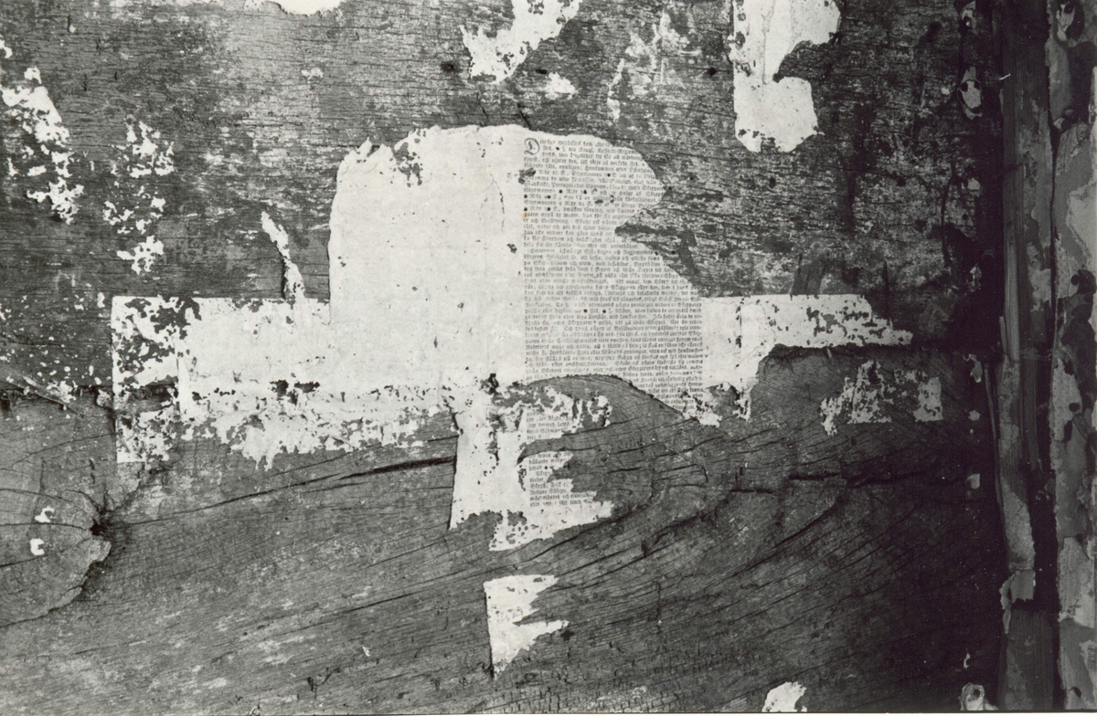 Salen i Krusenstiernska gården. Detalj av pappersfragment på västra väggen.
