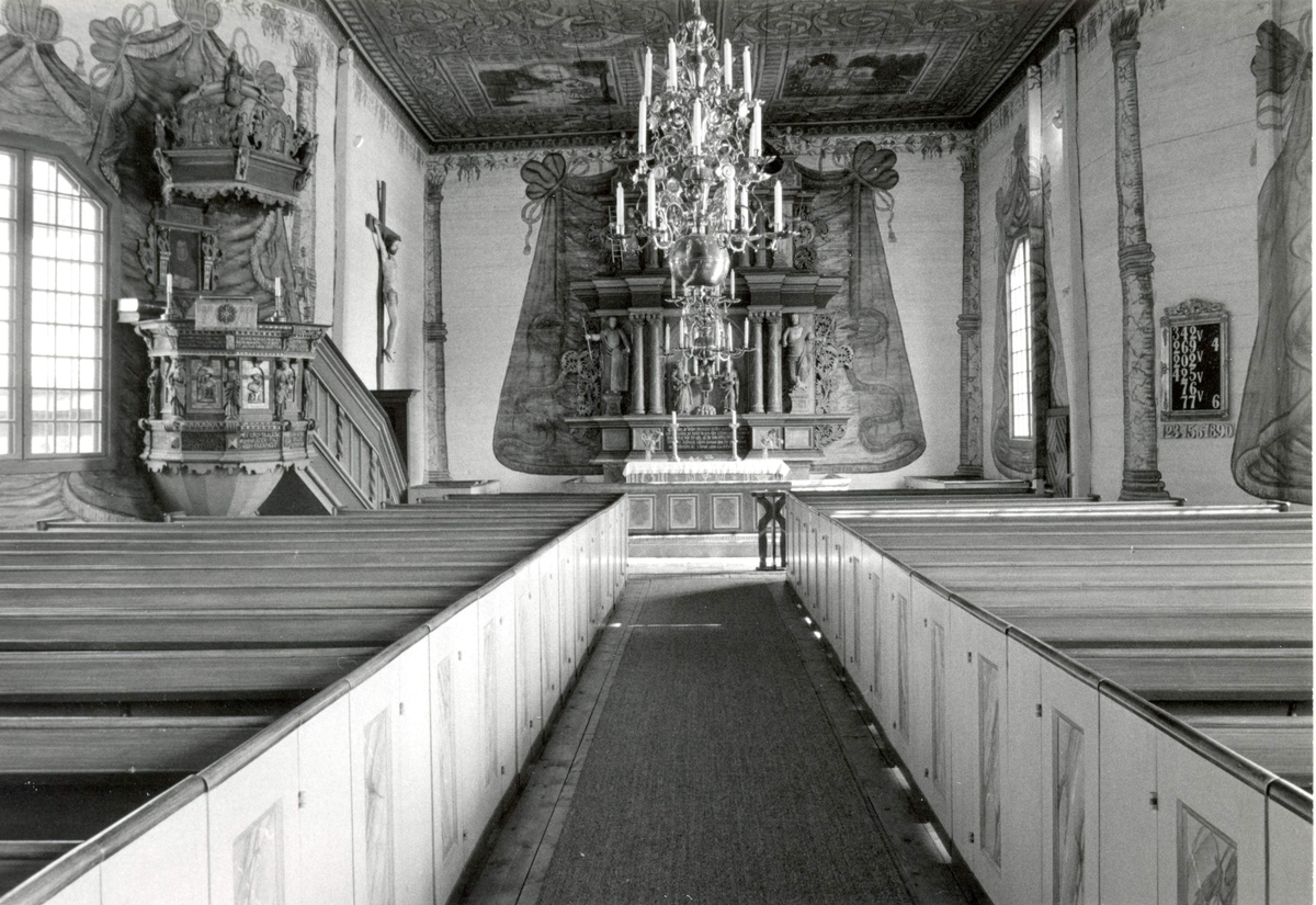 Interiören av Frödinge kyrka med kyrkbänkar, predikstol, ljuskronor, nummertavla och altare.