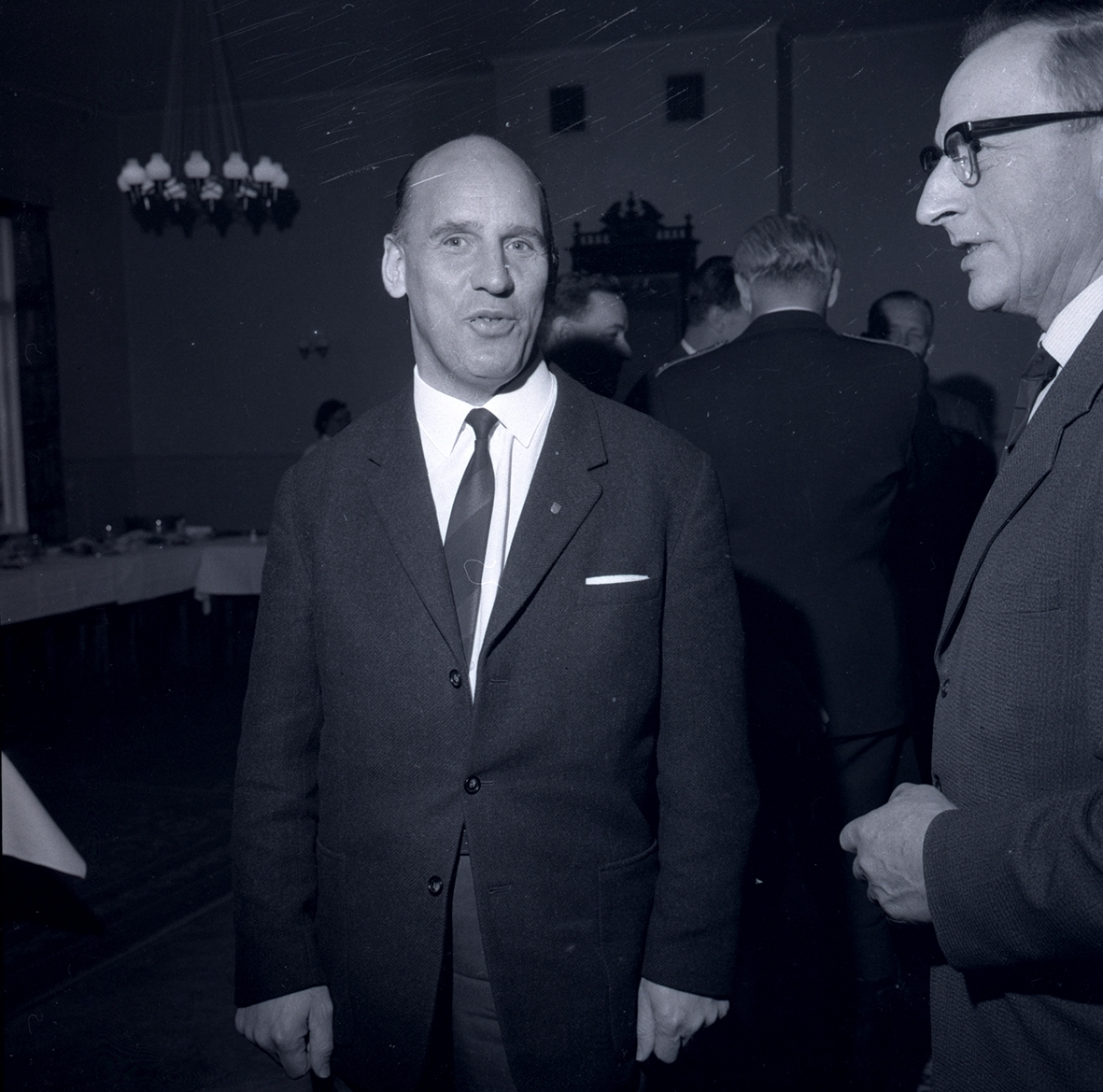 Titel: Bild i samband med militärövningen Ölandskriget. Herrar i kostym vid långbord.